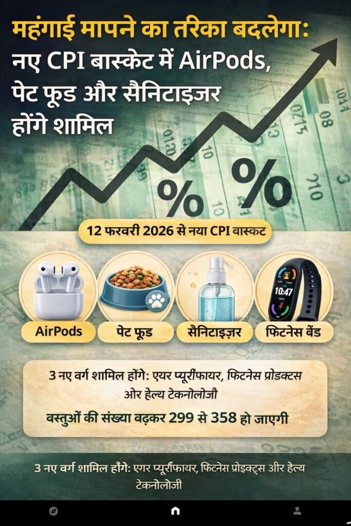 देश में महंगाई को मापने का तरीका अब बदलने जा रहा है। सरकार उपभोक्ता मूल्य सूचकांक (CPI) के बास्केट में बड़े बदलाव करने की तैयारी कर रही है। रिपोर्ट्स के अनुसार, 12 फरवरी 2026 से लागू होने वाले नए CPI बास्केट में कई आधुनिक और रोज़मर्रा में इस्तेमाल होने वाले नए उत्पाद जोड़े जाएंगे।